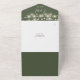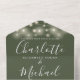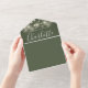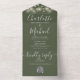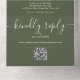 Le tout dans une seule faire-part de mariage avec de jolies lampes à cordes, des noms de style signature et une typographie chic sur un arrière - plan vert olive. L'invitation comprend une carte RSVP perforée avec un code QR. Conçu par Thisisnotme©