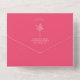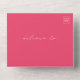 Illustration d'art en ligne blanche d'un motif feuille de palme sur un arrière - plan bleu avec texte blanc et design de coquillages sur arche rose avec bordure blanche. A l'extérieur est rose avec l'adresse de retour et l'illustration en feuille de palme sur le rabat. Rsvp propose du code qr et un format traditionnel.
