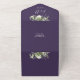 Tout en un violet reporté faire-part de mariage avec des feuilles botaniques verdoyants rustiques tombant sur une arche d'or renfermant une élégante typographie. L'invitation comprend une carte RSVP perforée avec votre code QR du site Web mariage. Conçu par Thisisnotme©