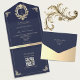 Invitation Tout En Un QR Code Baroque Marine Bleu Mariage or