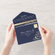 Faites de votre journée spéciale un moment inoubliable avec ce faire-part de mariage tout-en-un rose chic et bleu marine. Doté d'élégants motifs floraux dorés, d'un délicat motif papillon et d'un arrière - plan bleu marine sophistiqué, ce design allie luxe et romantisme. Le format pliable avec section RSVP le rend pratique et élégant pour vos invités. Idéal pour les mariages modernes et classiques. Remarque : Cette invitation tout-en-un nécessite une enveloppe distincte pour l'envoi. Nous vous recommandons de l'apparier avec une enveloppe A9 standard (5,75 po x 8,75 po) pour un meilleur ajustement.