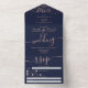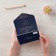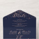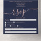 Rose or confetti bleu marine tout en un faire-part de mariage de calligraphie avec rsvp, hébergement, détails, et plus d'infos. Avec un script moderne et tendance.