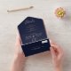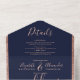 cadre de bordure géométrique or rose bleu marine tout en un faire-part de mariage de calligraphie avec rsvp, hébergement, détails, et plus d'infos. Avec un script moderne et tendance.