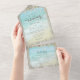 Cet invitation de mariage tout-en-un de destination de plage inclut l’invitation et la RSVP en déchirure, et peut être plié et envoyé par la poste afin que vous n’ayez pas besoin d’une enveloppe. Encadré d'un arrière - plan de bois gris patiné rustique, de belles vagues d'océan bleu aqua s'écrasent contre la plage et des lampes à cordes décorent le sommet. Veuillez consulter la collection pour de nombreux produits correspondants.