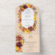 Éléments : florales d'automne vibrantes contre un arrière - plan de pêche pâle. Polices serif classiques. Couleurs : marsala, orange, sienne brûlée, prune, vert, pêche. Thèmes : rustique, automne, automne, boho, bohème, pays, vintage. Collection : Rustic Marsala Burnt Orange Fall Wreath Collection Mariage. Type de produit : Invitations de mariage tout-en-un