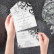 Invitation tout-en-un unique avec carte rsvp déchirante. Invitations de mariage festives et fantaisistes en noir et blanc. Des tourbillons décoratifs avec feuille et rose, et de belles polices avec ligatures tourbillonnantes. Faire-part de mariage simple, moderne et classique propre, avec vos détails de mariage personnalisés.