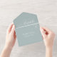 Cette simple faire-part de mariage tout-en-un moderne présente du texte blanc sur un arrière - plan vert de verre de mer. Ajoutez les noms de la mariée et du marié en calligraphie stylisée et les détails en police sans serif. Le RSVP détachable comporte du texte en verre de mer sur un arrière - plan blanc. Ajoutez votre adresse de retour en blanc sur le rabat extérieur en verre de mer et à l'arrière du RSVP.