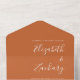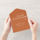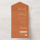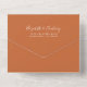Cette simple faire-part de mariage tout-en-un moderne présente du texte blanc sur un arrière - plan orange brûlé. Ajoutez les noms de la mariée et du marié en calligraphie stylisée et les détails en police sans serif. Ajoutez votre adresse de retour en blanc sur le rabat extérieur orange brûlé et sur le dos du RSVP amovible.