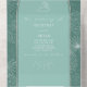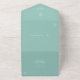 Illustration d'art en ligne blanche de palmier feuille motif sur aqua vert arrière - plan avec texte blanc et conception de coquillages sur aqua arche avec bordure bronzée. À l'extérieur, on trouve de l'aqua avec adresse de retour et illustration en feuille de palme sur le rabat. Rsvp propose du code qr et un format traditionnel.