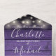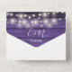 Le tout dans un faire-part de mariage avec de jolies lampes à cordes, des noms de style signature et de la typographie chic sur un arrière - plan rustique en bois violet. L'invitation comprend une carte perforée RSVP avec choix de repas. Conçu par Thisisnotme©