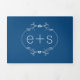 Elégant cadre blanc et initiales monogramme classique bleu triple faire-part de mariage. Il présente vos initiales dans un cadre blanc avec des feuilles sur le bleu sur la couverture. Les panneaux intérieurs comprennent votre texte tandis qu'il y a une photo sur le dos extérieur et la date du mariage sur le rabat extérieur.