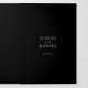 Moderne simple typographie minimaliste tendance noir tout en un faire-part de mariage budget modèle avec 2 photos, rsvp et détails avec numérisation des codes QR avec un script de calligraphie chic tendance et une superposition sombre. ++++++++++++++ Facile à personnaliser avec une ou deux photos personnalisées (vous pouvez télécharger la même photo sur les deux côtés) et des informations sur les invités des deux côtés ! L'invitation convient aux mariages classiques et contemporains.