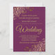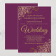Cette invitation de mariage simple mais élégante présente des lettres en or sur un arrière - plan magenta ou en cassis violet. Le design est sobre, mais les coins sont ornés d'un faux fil floral doré orné de boucles et de frites. Le texte est formel et traditionnel mais le design chic rend cette invitation appropriée pour tout mariage.