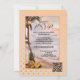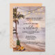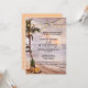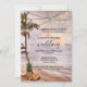 Une faire-part de mariage romantique avec une plage tropicale au coucher du soleil avec des lampes à cordes dans les palmiers et un ananas avec des fleurs. Au verso se trouve un modèle de code QR (facultatif). Beau pour un mariage de destination.