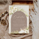Les invitations chic et tropicales à l'accouchement dans une palette de couleurs neutres séduisantes comprennent un élément central voûté portant les détails de la cérémonie et de la fête de l'église, accentué de frondes de palmier vert pâle, de feuillage de l'île de la plage, d'orchidées blanches, de botaniques secs et de pampas.