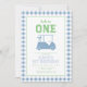 Thème de golf de premier anniversaire "Trou en un" avec chariot or et motif plaid bleu à damiers clair.