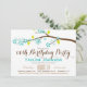 Joli, coloré, moderne adulte ou ado invitation à la fête d'anniversaire avec des fleurs turquoise, bleu clair, feuilles vert citron, brun brune branche blanche arrière - plan. Grande année pour les fêtes d'anniversaire du printemps, de l'été, de l'automne ou d'hiver. Design neutre et tendance pour homme ou femme, garçon ou fille. Invitation élégant et classe pour tout âge adulte ou ado important, y compris Sweet 16, 18th, 21th, 30th, 40th, 50th, 60th, 70th, 75th, 80th, 85th, 90th, 95th, 95, 100th anniversaire.