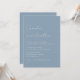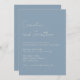 Carton d'invitation de mariage avec typographie de script et de machine à écrire bleu poussiéreux minimaliste avec détails du site Web RSVP.