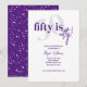 La typographie en gras avec calligraphie 50 est des invitations de fête d'anniversaire astucieuses en violet et blanc. Le dos présente un fond tout violet avec des taches/bulles blanches pour imiter les bulles dans le vin et le champagne pour célébrer comment nous vieillissons comme un bon vin. Tout le texte est entièrement personnalisable.
