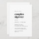 Cette invitation à la douche en couple de typographie noire moderne est parfaite pour un simple wedding shower. Le design minimaliste noir et blanc présente une police rétro mais contemporaine, avec une atmosphère bohème rustique unique. Parfait pour toute saison. Gardez-le minimal, en l'état, ou ajoutez vos propres graphiques et illustrations.