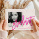 Cette invitation de remise de diplômes 2024 moderne présente une typographie de script néon rose ombre et une photo sur le devant, avec un arrière - plan rose magenta vibrant et des détails en texte blanc sur le dos.