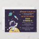 Invitation de fête d'anniversaire avec un arrière - plan bleu foncé avec étoiles jaunes dans l'arrière - plan. Au-dessus se trouve une lune jaune et un astronaute qui agite. Derrière lui se trouve une planète avec des anneaux et un vaisseau-fusée qui s'envole dans l'espace.