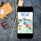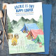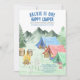 Un Happy Camper Camping Party Invitation - parfait pour une fête de premier anniversaire de petit garçon. Cette aquarelle a une scène de camping en forêt de montagne avec tentes, feu de camp, mortiers et accessoires de camp, y compris équipement de randonnée, guitare, lampe de poche et lanterne.