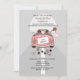 Une adorable invitation montrant les jeunes mariés s'enfuir dans une décapotable avec un panneau "marié" et des boîtes attachées à l'arrière de leur voiture. La mariée est sur le point de lancer son bouquet alors qu'elle s'éloigne.