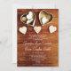 Ce faire-part de mariage rustique est parfait pour tous les mariages occidentaux du pays. Il présente un motif rustique à grains de bois de grange imprimé de part et d'autre de l'invitation avec des culottes en bois et une boîte en forme de coeur tenant plus de petits coeurs en bois. Le fond de l'invitation a le même design rustique de la campagne avec le mot "Amour" dans le script.