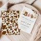 COWBOY COW (PINK) - Cette adorable invitation au baby shower de fille de Rodeo Cowprint, South Western est entièrement modifiable, peut être imprimée et envoyée par la poste ou l'évènement d'anniversaire peut être partagé par e-mail et les médias sociaux ! Cette Western Cowgirl Baby shower Invitation présente une paire de Cowboy Boots & Cowboy Casquette, Lasso, et un bandana rose accroché sur une ligne, entouré d'empreintes brunes et de roses roses. Il y a aussi un côté noir brun. Ce Rodéo Wild West, Baby shower Invitation est sûr de compléter n'importe quel baby shower à thème occidental, révélation de genre, ou autre événement à thème cowgirl! En utilisant le logiciel Zazzle facile à utiliser (pas de téléchargement nécessaire) directement dans votre navigateur, vous achetez et personnalisez tout simplement au même endroit. C'est aussi facile que ça !
