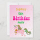 Une Unicorne mignonne avec une crinière arc-en-ciel et la queue aide à célébrer votre anniversaire. Modifiez facilement les informations à vos propres informations pour votre invitation personnelle d'anniversaire personnalisée. Des taches roses, vertes et dorées.