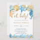 Unter dem Meer lädt die blaue und goldene Babydusche mit Aquarellfarben-Seepferden, Seesternen, Muscheln und Korallenriffen mit kalligrafischer Darstellung zum Entspannen ein. Klicken Sie auf die SCHALTFLÄCHE BLAUE DESIGN TOOL, um eine erweiterte Anpassung dieses Designs zu erhalten. Matching-Elemente sind ebenfalls verfügbar.