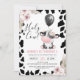Floral Black White Cow Print Balloon 1st Birthday Invitation Jolie vache noire et blanche à thème de premier anniversaire invitation pour une petite fille avec un dessin animé comme la vache, noir un ballon, un motif d'impression de vache et des arrangements floraux roses. Cette invitation de première année de vache sainte est une façon mignonne pour les invités invitations à une fête de premier anniversaire à thème de vache.