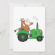 Une vache conduisant un tracteur vert. Cette conception semble vraiment efficace sur ces invitations