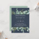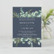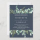 Chic et élégant faire-part de mariage botanique d'eucalyptus. Frammentez vos détails du jour de mariage avec des feuilles eucalyptus dans la verdure et le feuillage bleu avec un arrière - plan bleu nuit et des lettres blanches élégantes. Personnalisez facilement ce modèle d'invitation avec les détails de votre jour de mariage.