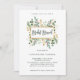 Cette magnifique invitation de brunch de la douche nuptiale de Noël comprend des verdure et des feuilles de vacances avec des feuilles en faux or et des baies sèches rouges, et un cadre doré central sur un arrière - plan blanc moderne. La typographie de script "bridal brunch" est très tendance.