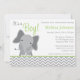Une invitation orientée moderne de baby shower d'éléphant gris et vert. Perfectionnez pour un baby shower de petit garçon.