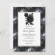 Faire-part de mariage gothique d'Halloween avec un rose noir, crânes floraux et calligraphie vintage.