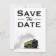 Invitation de célébration de fiançailles de mariage avec affiche de locomotive vintage Save the Date.
