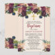 Elégante aquarelle bordeaux et floral roux bébé fille Baptême design d'invitation avec des touches de bleu foncé et vert olive foncé feuilles dans un haut bouquet de type swag entourant les détails de votre bébé doux. Une croix de trinité de couleur or se trouve sous le motif floral, et l'arrière comporte une répétition du swag floral avant sur le dessus et le bas de l'arrière - plan de rougissement coordinateur. Ce design floral composite de Holiday Hearts Designs (droits réservés) est prêt pour vous à personnaliser.
