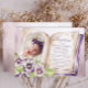 Ce design est unique en ce sens qu'il est créé dans les pages d'un livre avec une photo voûtée de votre petit à gauche niché au milieu d'un lit de violettes violettes. L'invitation repose sur la page du livre à droite avec une croix de trinité de ton or dans le coin supérieur droit. Un effet de vieillissement a été appliqué à l'aspect général du design (sauf pour la photo) pour donner un aspect usé du design. L'arrière - plan est un effet de fausse parties scintillant pourpre foncé et subtil qui a également été appliqué sur le dos. Le dos est recouvert de pois minuscules dans le ton or muet. Conception composite par Holiday Hearts Designs.