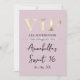 Cette invitation de fête personnalisée présente un design VIP glamour sur un fond rose doux. Le titre VIP est imprimé dans une police de style feuille d'or, suivi du titre de l'événement. Une bande de diamants sépare le texte. Le lieu et l'heure de la fête ou de l'événement sont imprimés au verso. C'est parfait pour un anniversaire, un sweet 16, une douche de mariée ou une autre célébration élégante.