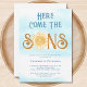 Famille Invitation et amis à votre baby shower de jumeaux sur le thème du soleil avec cette mignonne invitation au soleil. Il présente le texte "Here Come The Sons" en typographie rétro bleue avec un joli soleil d'aquarelle jaune sur un arrière - plan de ciel bleu. Facile à personnaliser. Aquarelle originale © Michele Davies.