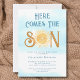Famille Invitation et amis à votre baby shower sur le thème du soleil avec cette mignonne invitation de baby shower pour garçons de soleil. Il présente le texte "Here Comes The Son" en typographie rétro bleue avec un joli soleil d'aquarelle jaune sur un arrière - plan du ciel bleu. Aquarelle originale facilement personnalisable © Michele Davies.