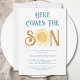 Famille Invitation et amis à votre baby shower sur le thème du soleil avec cette mignonne invitation de baby shower pour garçons de soleil. Il présente le texte "Here Comes The Son" en typographie rétro bleue avec un joli soleil d'aquarelle jaune. Le dos est décoré d'un motif souriant. Facile à personnaliser. Aquarelle originale © Michele Davies.