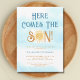 Famille Invitation et amis à votre baby shower sur le thème du soleil avec cette mignonne invitation de baby shower pour garçons de soleil. Il présente le texte "Here Comes The Son" dans la typographie rétro avec un joli soleil d'aquarelle jaune et arrière - plan bleu ciel. Facile à personnaliser. Utilisez l'outil de conception pour modifier la taille, le style ou la couleur du texte. Aquarelle originale © Michele Davies.