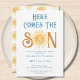 Famille Invitation et amis à votre baby shower de garçons sur le thème du soleil avec cette mignonne invitation au soleil. Il présente le texte "Here Comes The Son" dans une typographie bleue élégante avec un joli soleil d'aquarelle souriant. L'arrière est décoré d'un motif jaune. Facile à personnaliser. Aquarelle originale © Michele Davies.