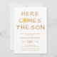 Famille Invitation et amis à votre baby shower sur le thème du soleil avec cette mignonne invitation de baby shower pour garçons de soleil. Il comporte le texte "Here Comes The Son" et une jolie aquarelle jaune souriante soleil. L'arrière est décoré d'un motif solarium. Facile à personnaliser. Aquarelle originale © Michele Davies.