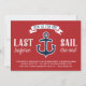 Cette jolie invitation à la bachelorette à thème nautique présente une ancre bleu marine, une bannière blanche rustique, une typographie blanche amusante qui dit "Dernière voile avant le voile", et un arrière - plan rouge.