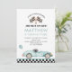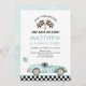 Cette adorable invitation présente une voiture de course bleu aquarelle.